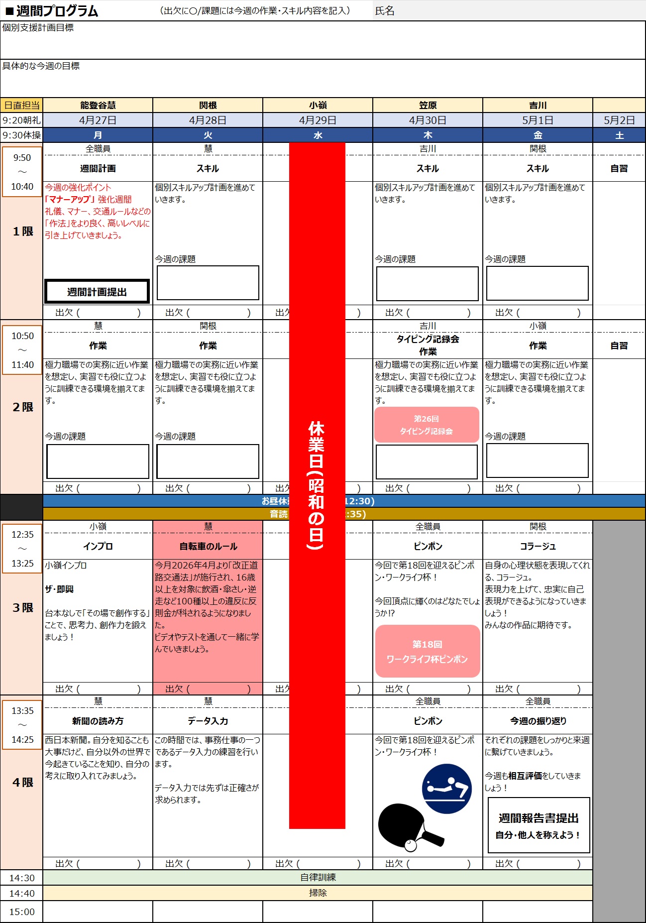 自立した生活を目指す、自立訓練(生活訓練)と一般企業に就職するために様々な訓練を行う就労移行支援を提供します。