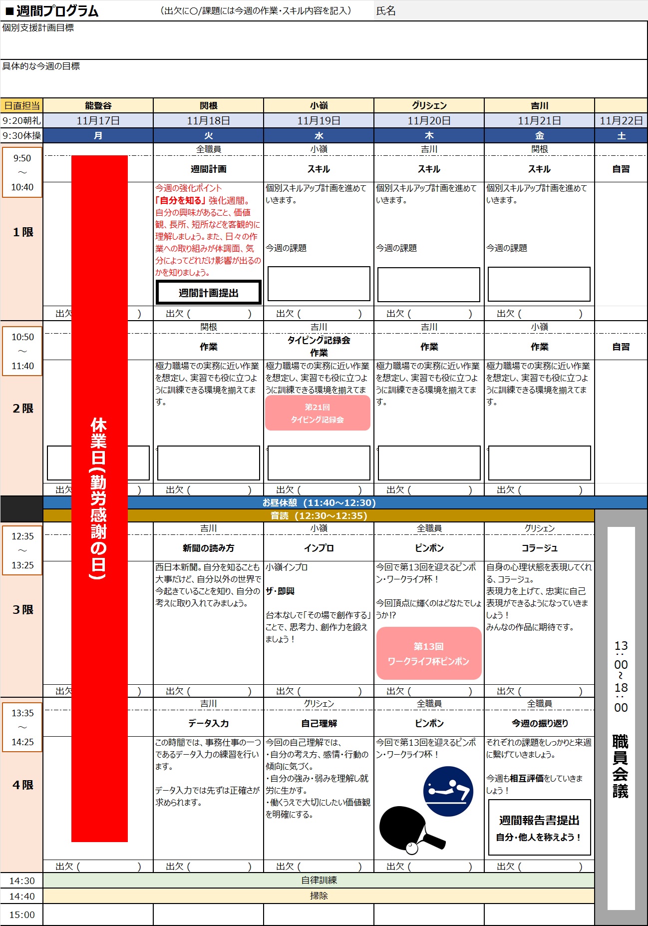 私たちの事業所では、訓練以外の時間も楽しく活動できるように、利用者とスタッフが手と手を繋いで取り組んでいます。