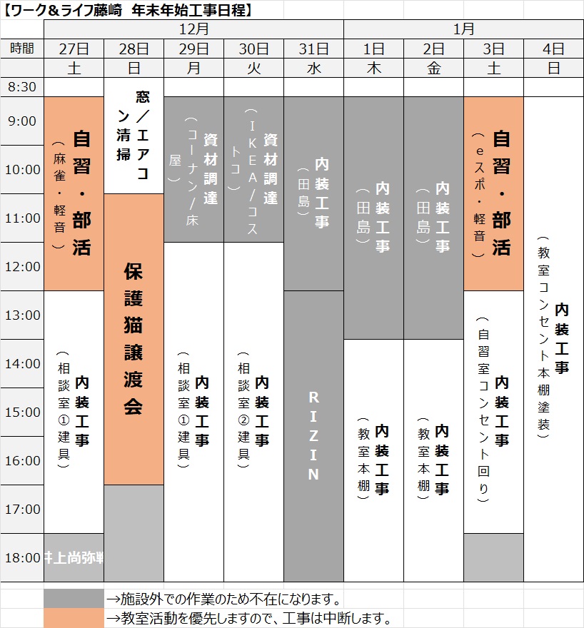 2025年12月27日~2026年1月4日の開所予定と工事日程です。 今回は大きな改装工事は無いのですが、塗装がある為に窓を開放して換気をすることがあります。